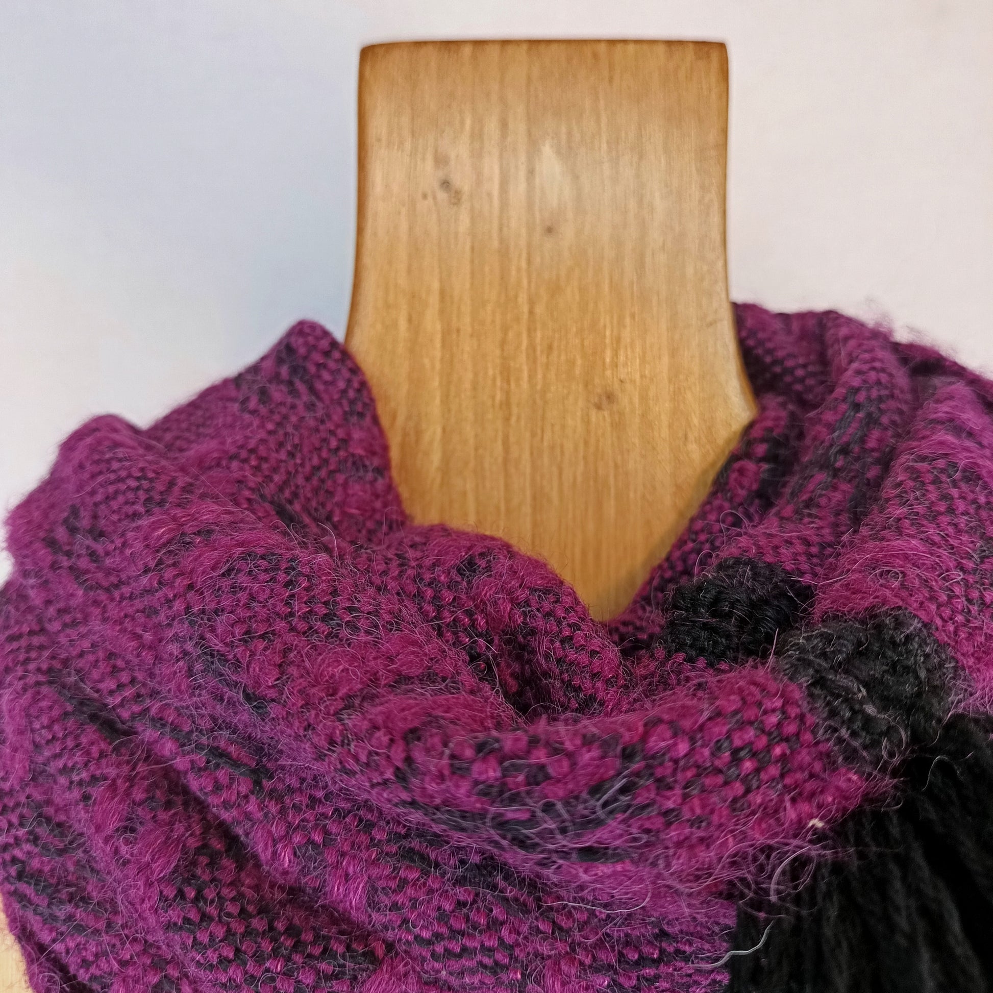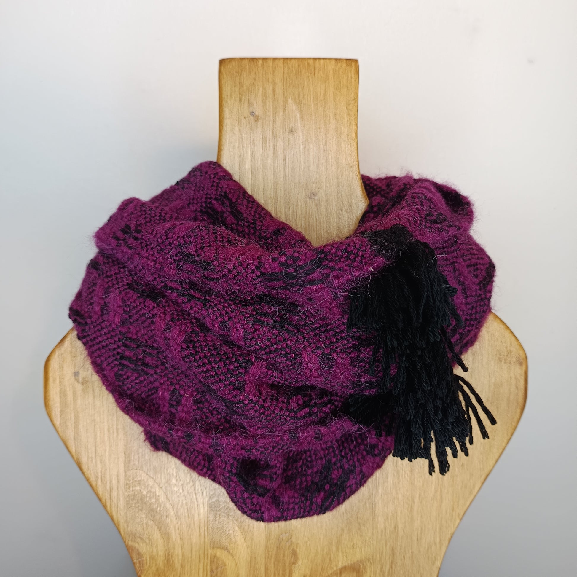 Ce col de laine double tour, tissé à la main dans de subtiles harmonies de noir et fuchsia, apporte élégance et sophistication à vos tenues hivernales.