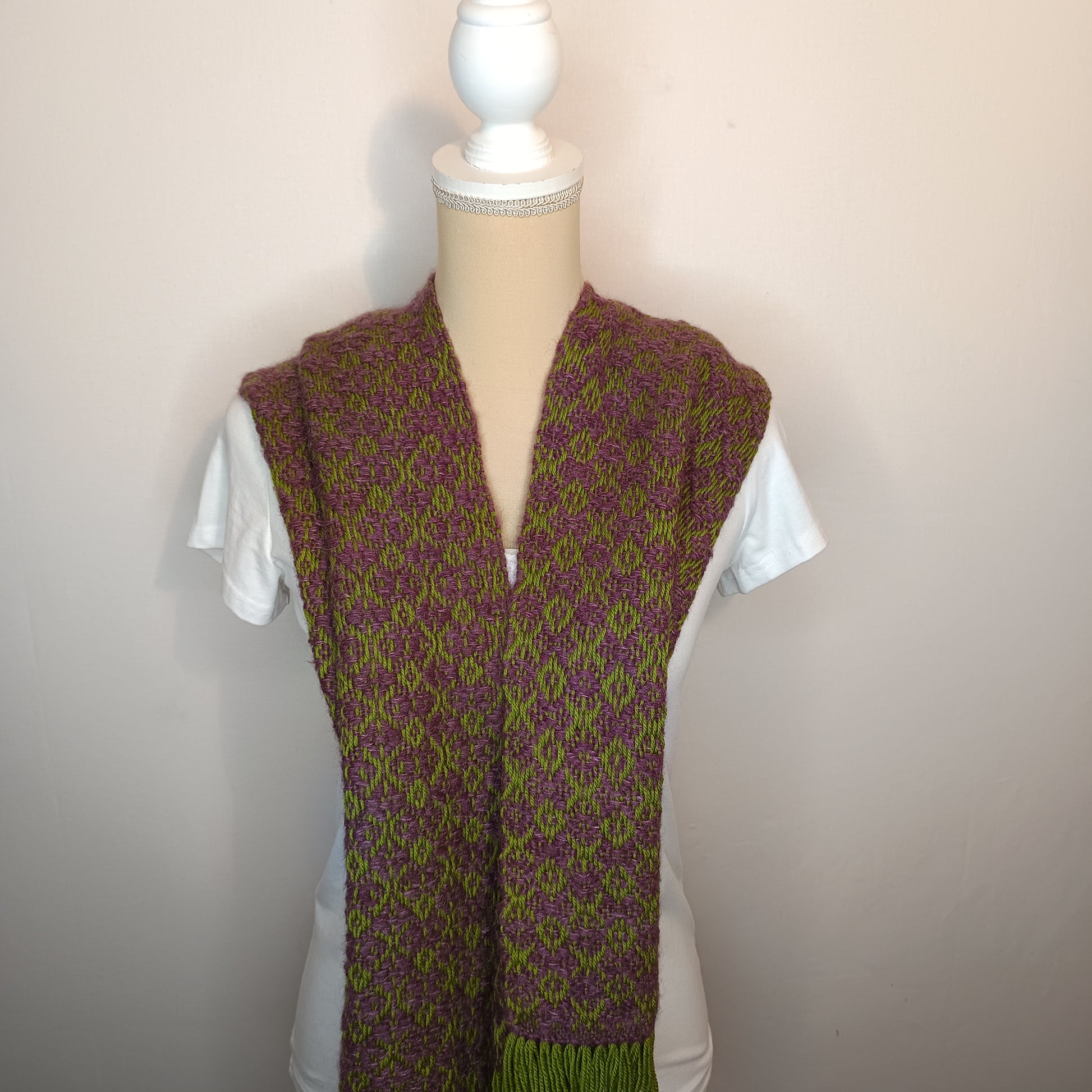 Cette écharpe tissée à la main se décline dans une association de vert et de violine, un contraste tout en finesse.