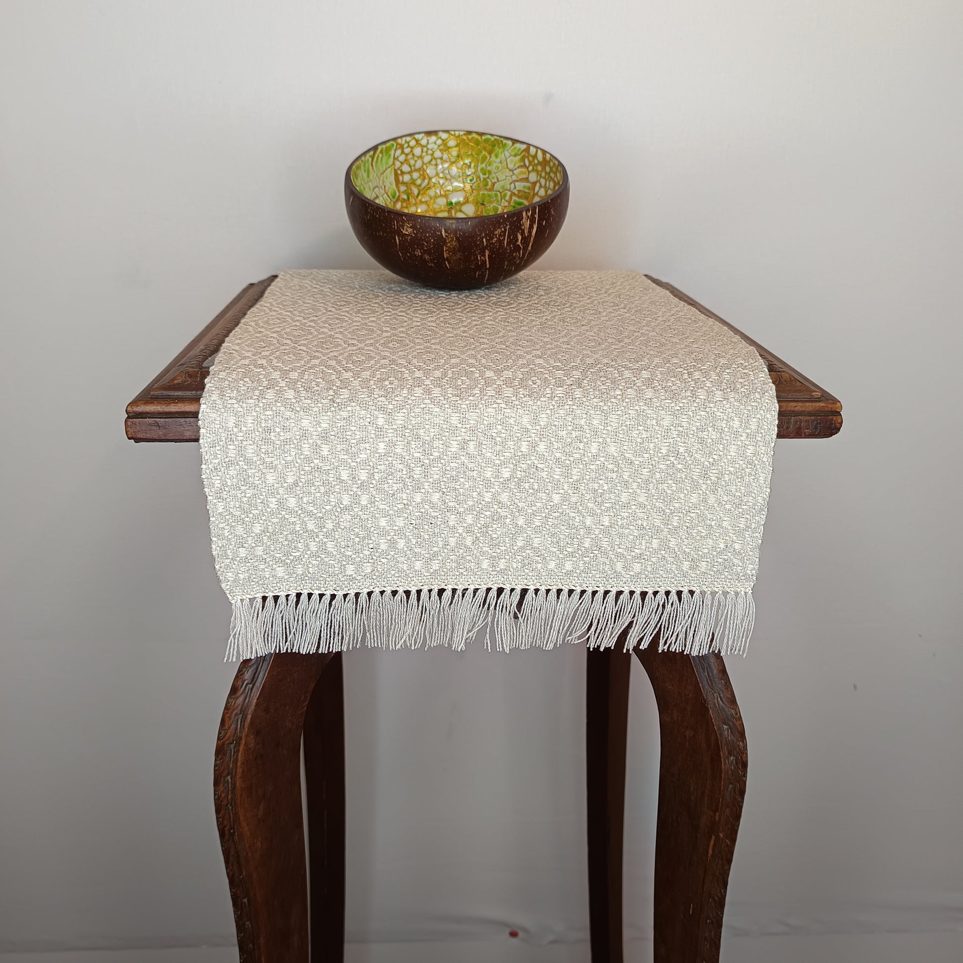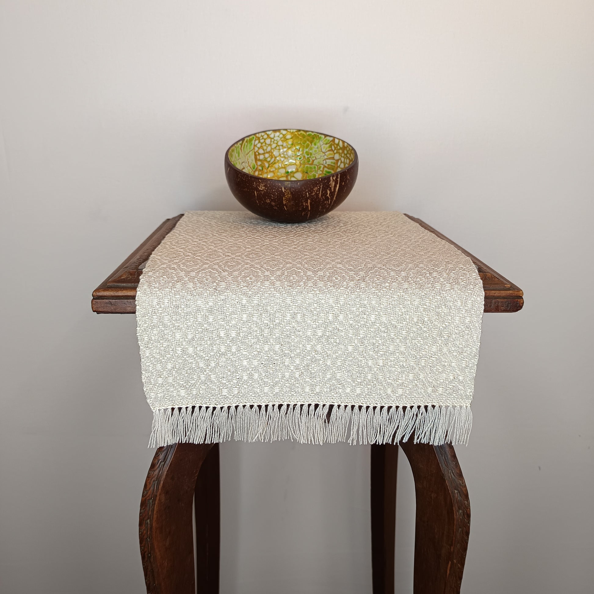 Ce napperon tissé à la main associe le coton/lin écru à l’éclat lumineux de la soie. Ses dimensions de 24 x 45 cm lui confèrent une présence élégante, parfaite pour sublimer vos espaces avec raffinement.